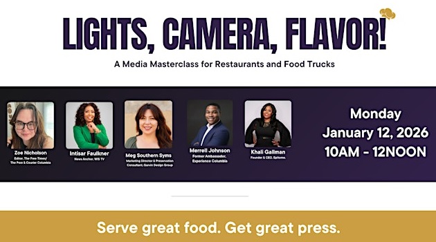 Local restaurant owners, food truck operators, caterers, and other food-based businesses can learn how to attract media attention at Lights, Camera, Flavor., a media masterclass set for January 12 from 10 a.m. to noon at the Cathy Novinger Leadership Center, 1107 Williams Street, Columbia.