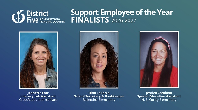 Support Employee of the Year winners from each school include: Elizabeth Dewalt (Academy For Success), Dina LaBarca (Ballentine Elementary), Bruce Hammond (Center for Advanced Technical Studies), Alyssa Hood (Chapin Elementary), Jessie Owen (Chapin High), Sam Patterson (Chapin Intermediate), Ann Ihrie (Chapin Middle), Jeanette Farr (CrossRoads Intermediate), Kay Dickerson (District Office), Porsche Craft (Dutch Fork Elementary), Beth Wilson (Dutch Fork High), Cindy Chapman (Dutch Fork Middle), Driani Harris (FIVE), Jess Catalano (H. E. Corley Elementary), Kylee Denter (Harbison West Elementary), Sheri Richards (Irmo Elementary), Cassandra Borner (Irmo High), Judith Connor (Irmo Middle), Jordan Nelson (Lake Murray Elementary), Kim McCarthy (Leaphart Elementary), Allyson Utter (Nursery Road Elementary), Sydney Conley (Oak Pointe Elementary), Gail Pennington (Piney Woods Elementary), Michelle Long (River Springs Elementary), Chudney Ellis (Seven Oaks Elementary), Chrissy Gregg (Spring Hill High), Ta’Nico Creed (Transportation).