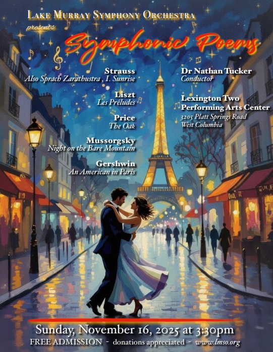 The Lake Murray Symphony Orchestra will open its 23rd season with a concert titled Symphonic Poems on Sunday, November 16, at 3:30 p.m.