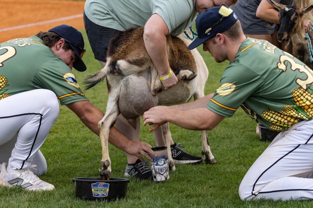 (Photos by Lexington County Blowfish) Lexington County Blowfish players milk a cow in between innings as part of “Home Grown, Home Run” promotion.
