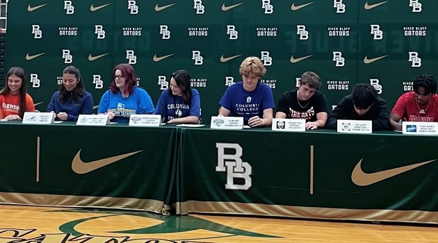 River Bluff recognized seven student-athletes who signed letters of scholarships Wednesday. They were Serena Gasparelli (Columbia College/women’s lacrosse), Maddox Free (USC-Sumter/baseball), Gavin Hunt (Columbia College/men’s lacrosse), Julia Salo (Converse/women’s soccer), Savannah Parrett (Allen/track and field), Dax Avery (Erskine/men’s basketball), Yasir Cromer (Francis Marion/men’s basketball) and Anna Eckstrom (Clemson/cheer).